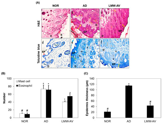 Effect of the LMW-AV on AD-induced skin. (A) Histopathological analysis of the dorsal area of the skin. Histopathological analysis of dorsal tissue. (a–c) Slide sections of dorsal tissue were evaluated by staining with H&E staining and observed at 100× magnification. (d–f) Slide sections of dorsal tissue were evaluated by staining with 0.25% toluidine blue and observed at 200× magnification. The yellow arrows indicate skin thickness of epidermis, the yellow arrow indicates epidermis, the black arrows indicate mast cells in epidermis and dermis, and the orange arrows indicate eosinophil in dermis. (B) The number of infiltrated mast cells per specific area was measured using toluidine blue-stained section and eosinophils per specific area was measured using H&E staining image. (C) Epidermis thickness per specific area was measured. Data are presented as mean ± SD (n = 5). * p < 0.05 indicates significant differences compared with the NOR group and # p < 0.05 indicates significant differences compared with the AD group.