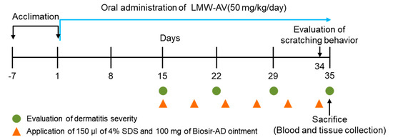 All surgical procedures were performed under aseptic conditions. All mice were anesthetized during the operation using intraperitoneal injections of combination solution of ketamine, rompun, and phosphate-buffered saline (a ratio of 2:2:7, respectively) and the dorsal skin surface was shaved. To disrupt the skin barrier, 150 μL of 4% (w/v) sodium dodecyl sulfate was topically applied to the shaved dorsal skin surface 3 h before Biostir-AD ointment application. Biostir-AD ointment was applied twice/week for 3 weeks to induce AD-like skin lesions. To investigate the preventive effect of LMW-AV on AD-like skin lesions in NC/Nga mice stimulated with Biostir-AD ointment, LMW-AV was orally administrated to mice using an oral-zoned needle connected to a 1 mL syringe at a dose of 50 mg/kg/day for 5 weeks (from 2 weeks before the first application of Biostir-AD ointment). A flow chart of the animal experiment is shown in Figure 4.