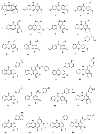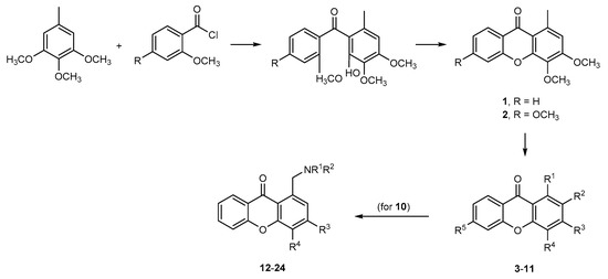 Xanthones are aromatic oxygenated heterocyclic molecules, with a dibenzo-γ-pyrone scaffold known as 9H-xanthen-9-one [15]. Four distinct approaches were developed and optimized over the last years toward the synthesis of this scaffold [16]. In this work, xanthones 1 and 2 were previously synthesized in our laboratory, in the scope of other projects, via the benzophenone method from 1,2,3-trimethoxy-5-methylbenzene and the appropriate methoxybenzoyl chloride (Scheme 1) [17,18]. Xanthones 3–11 were also previously obtained in the scope of other projects through straightforward transformations such as chlorination [17], bromination and solvolytic displacement of the bromine atoms [18]. Regarding aminated xanthones 12–24, were resynthesized for this work via a reductive amination of 3,4-dimethoxy-9-oxo-9H-xanthene-1-carbaldehyde (10) and the appropriate amines [19].