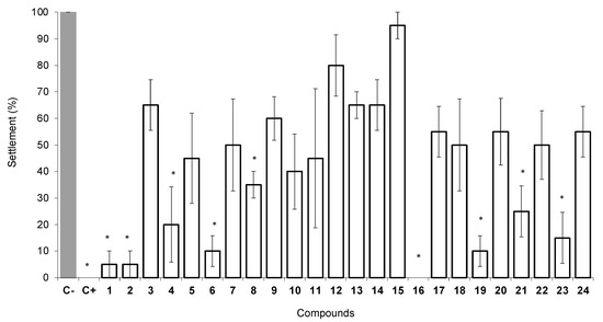 To evaluate the antifouling activity of a series of 24 xanthone derivatives, the anti-settlement of Mytilus galloprovincialis larvae was selected as the first screening assay. This blue mussel is a particularly important fouling species with high recruitment rates and the ability to outcompete other species. From the series of xanthone derivatives tested, 1, 2, 4, 6, 8, 16, 19, 21, and 23 presented highly significant anti-settlement responses at 50 μM (p < 0.05) against the settlement of M. galloprovincialis larvae when compared to the negative control (Figure 3).