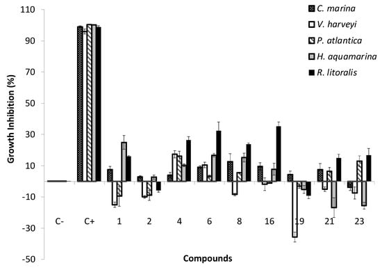 Therefore, the antibacterial activity of the nine most promising antifouling xanthones 1, 2, 4, 6, 8, 16, 19, 21, and 23 was evaluated against five strains of marine biofilm-forming bacteria: Cobetia Marina, Vibrio harveyi, Halomonas aquamarina, Pseudoalteromonas atlantica and Roseobacter litoralis (Figure 4). None of the tested compounds were able to significantly inhibit (> 30% inhibition) the growth of C. marina, V. harveyi, P. atlantica, and H. aquamarina. Only xanthones 6 and 16 presented a growth inhibition higher than 30% inhibition of the strain R. litoralis in the screening bioassays at 12.5 µM (Figure 4); however, this bioactivity was not confirmed for the two compounds in the concentration–response studies (Figure S1) at concentrations between 2 and 32 µM. According to these results, these compounds should not be considered as antibacterial agents, at least against these biofilm-forming strains.