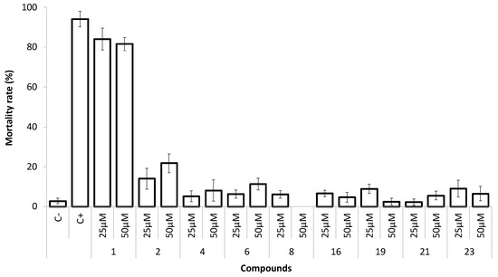 The marine ecotoxicity of the most promising antifouling compounds (1, 2, 4, 6, 8, 16, 19, 21, and 23) was evaluated using the nauplii of Artemia salina at 50 and 25 µM (Figure 5).