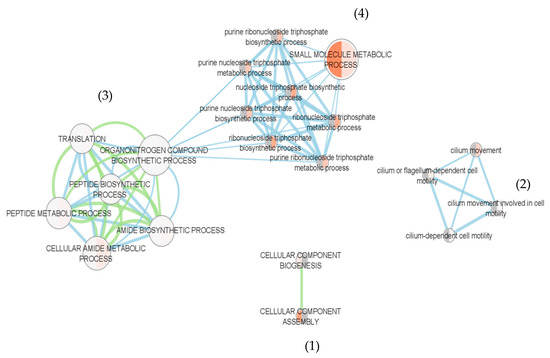 In Figure 7, classes of related functions are distributed close to each other, forming networks or nodes. Four nodes are recognized. Node 1 group: the molecular functions related with cellular component assembly and biogenesis. Proteins included in this node are Histone H1-delta, histone H4, protein SET (constituents of the chromatin and nucleosome), 40S ribosomal protein, clathrin (constituent of small transport vesicles), plastin-3 (component of actin filament) and villin-1, a protein involved in the reorganization of microvillar actin filaments and actin filament capping, polymerization, and severing. Villin-1 was affected exclusively by compound 21. Node 2 group: several functional classes related to cilium movement. Associated to these functional classes are several cilia components (tektin proteins and radial spoke head proteins 9 and 4). Radial spoke head proteins were affected only by compound 21. In mussels, cilia are responsible for driving water flow through filtration for respiration and feeding along the ventral groove toward the mouth. The effects of compounds on cilia integrity might interfere with the health status of mussels [25], contributing to an energetic investment in vital functions instead of production of byssal threads for settlement. Proteins related with structural constituents of the cytoskeleton, including ciliary microtubules units (tubulin alpha and beta chains, and radial spoke head proteins) were previously found to be downregulated in M. galloproviancialis larvae exposed to the natural compounds portoamides [23] and associated to an anti-settlement response.
