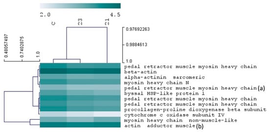 Heatmap of proteins putatively related in mussel adhesion mechanisms. Protein expression is represented in a color map. Rows represent proteins which are clustered according to their expression similarities. The columns represent the experimental groups, control (C), compound 21 (21) and compound 23 (23). Detailed information about protein expression and functions can be found in the Supplementary Material (Tables S1 and S2). Expression differences were reported in both experimental groups, for all proteins except pedal retractor muscle myosin heavy chain (a) and actin adductor muscle (b) with variations detected respectively in the group 21 and group 23.