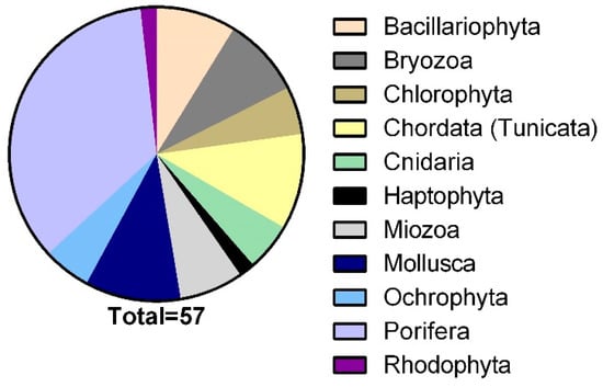Invertebrates comprise the group richest in biodiversity among animals and include about 30 phyla. The major phyla include Porifera, Cnidaria, Annelida, Bryozoa, Mollusca, Arthropoda, and Echinodermata [11]. Some of these phyla are characterized by few species, while others include more than 85% of all described animal species and consist of over a million species [11]. In 2012, Leal et al. [12] reported the characterized MNPs and classified them according to phyla based on their invertebrate source. They found that approximately 80% of these were from the phyla Porifera (47.1%) and Cnidaria (32.9%).