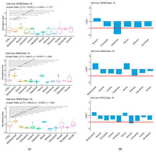 Distribution of positive hits among the taxonomic groups represented in the library. (a) Kruskal–Wallis test (non-parametric test) performed for each cell line (A2780, A549, PNT2) at a dose of 10 µg/mL. Post hoc tests were applied to identify which phylum groups were statistically different (significant codes: 0.0001 ‘****’, 0.01 ‘**’, 0.05 ‘*’). (b) Positive (negative) log2 fold-change for significant comparisons (i.e., p-value < 0.05) between phylum groups and untreated cells (CTRL-) are shown. Red line indicates treatment with 50% mortality.
