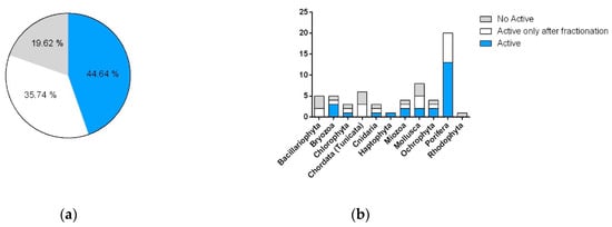 Cytotoxic activity of the taxonomic groups represented in the library. (a) Total percentages of positive hits against cancer cell lines A549 and A2780. (b) Number of cytotoxic species grouped by phyla. Blue indicates organisms with activity in raw extracts and SPE fractions. White indicates organisms with activity only in SPE fractions. Grey indicates samples that are not active.
