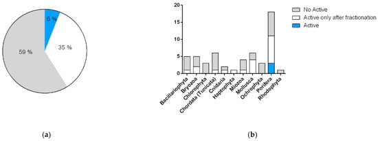 In comparison to the cytotoxicity reported above, most of the samples (59%) did not show any antimicrobial potential. However, the tests showed a clear increase in activity after fractionation, with a positive response in 6% of the raw extracts versus 35% of positive hits in the enriched SPE fractions (Figure 5). With the exception of dinoflagellates and diatoms, microalgae did not seem to produce antimicrobial products. On the contrary, the best positive score was observed in molluscs, with almost 80% of the samples showing antimicrobial activity, and sponges.