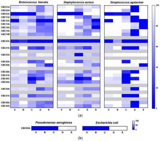 Heatmap showing the percentage of inhibition of Gram+ (a) and Gram− (b) bacterial strains after treatment with the active samples of the MNP library at the concentration of 50 mg/mL. X = raw extracts; B–E = SPE fractions.