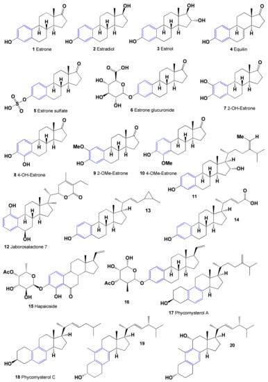 Estrone, or (8R,9S,13S,14S)-3-hydroxy-13-methyl-7,8,9,11,12,14,15,16-octahydro-6H-cyclopenta[a]phenanthren-17-one (1), is produced in vivo from androstenedione and/or testosterone via estradiol. The above-mentioned estrogens show estrogenic activity with various variations [,], although changes in the structure of estrogens D ring may also demonstrate anticancer activity []. The presence of female sex hormonal (1–4) estrogens was first detected in plants in 1926 by Dohrn and co-workers [] and then, in the 1930s, simultaneously by Butenandt and Jacobi [] and Skarzynski []. Recently, Janeczko and Skoczowski [] published a survey in which they summarized the data on the presence of mammalian sex hormones and their physiological role in plants. These hormones, such as 3,17β-dihydroxy-1,3,5(10)-estratriene, rosterone, testosterone, or progesterone, were present in 60–80% of the plant species investigated. Butenandt and Jacobi [] isolated estrone (1) from seeds and pollen of Hyphaene thebaica, Glossostemon bruguieri. Glycyrrhiza glabra, Malus pumila, Phoenix dactylifera, Ph. vulgaris, Punica granatum, Salix caprea, and Salix sp. The chemical structures of steroids and triterpenoids are shown in Figure 1, and biological activity is shown in Table 1.