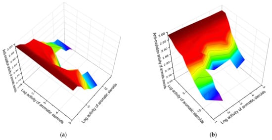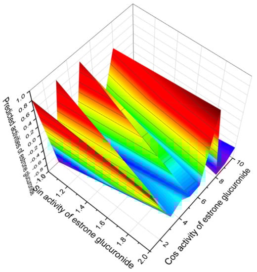 Among the second group of aromatic steroids that demonstrate strong antihypercholesterolemic activity, and a 3D graph of predicted and calculated antihypercholesterolemic activity is shown in Figure 4; the strongest steroid is estrone glucuronide (6), and a 3D graph of its predicted pharmacological activities is shown in Figure 5.