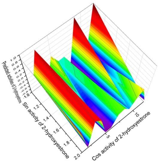 A 3D graph of the predicted and calculated activities of aromatic steroids belonging to the first group is shown in Figure 2. From the first group of steroids that are inhibitors of ovulation, 2-hydroxyestrone (7) can be distinguished, which has a confidence level of more than 95%, and its predicted activities are presented in Figure 3. Additionally, 3D graphs that demonstrate the predicted pharmacological activity were obtained using the Origin Pro 2021 graphical program. The program analyzes the data obtained by the PASS program and builds graphs that are given in this publication.