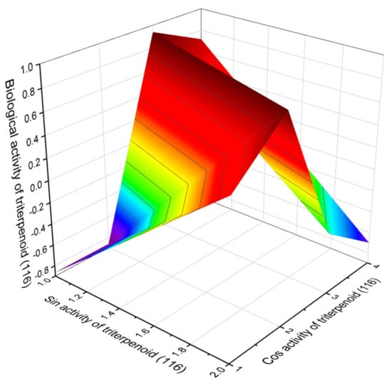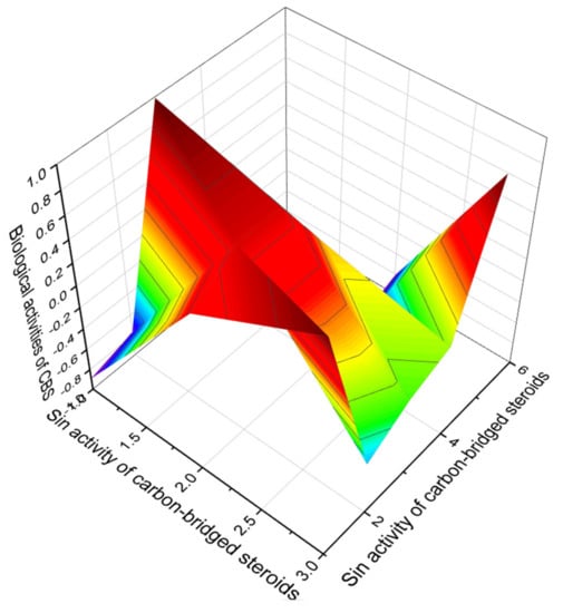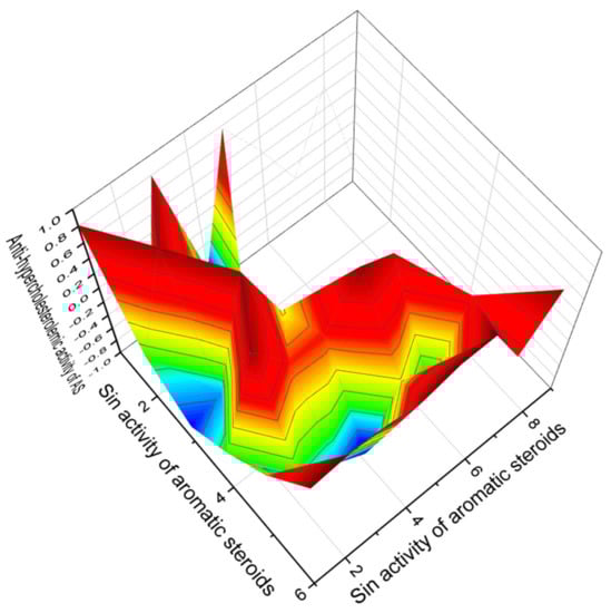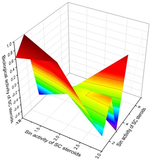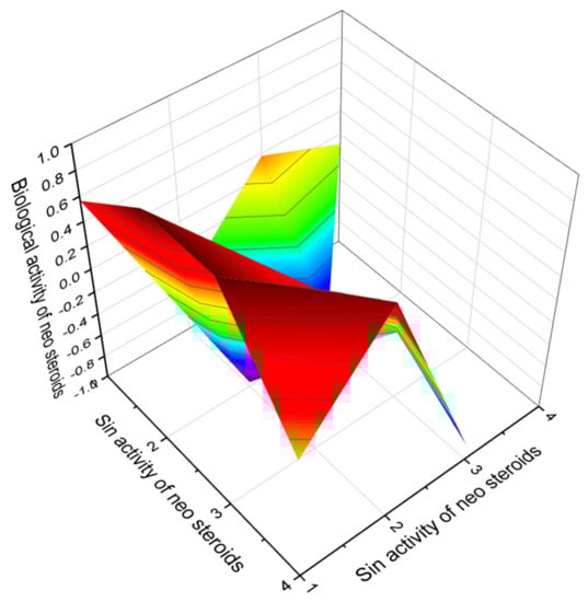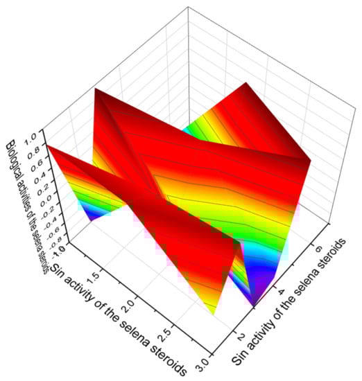 Steroid phosphate esters are of great practical interest in medicine, as they are wound healing agents. The confidence level of steroid 21 is 97.5%. Figure 7 shows the 3D graph of biological activities with a dominant property as a wound healing agent.