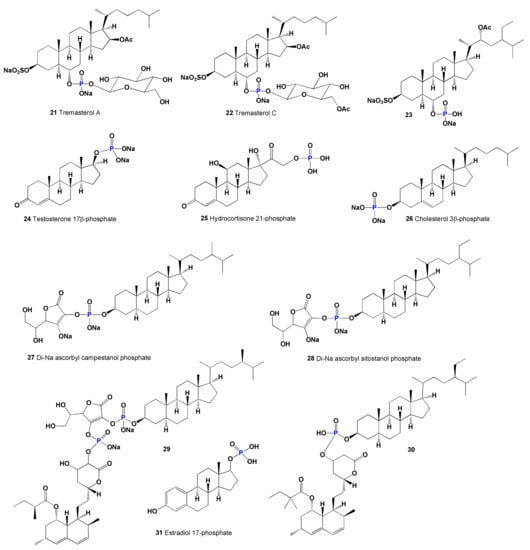 Steroid phosphate esters are rare lipid molecules that can form the building blocks of biological membranes and have been found more recently in starfish extracts. So, for the first time, steroid phosphates were discovered more than a quarter of a century ago by Italian scientists from the University of Frederico II, in the city of Napoli. Unique steroids were isolated from the extract of the polar lipids of the starfish Tremaster novaecaledoniae, which was collected at a depth of 530 m of New Caledonia []. The isolated phosphated steroid glycosides were called tremasterols A and C, and their structures were identified as 3β-O-sulphated, 6α-O-phosphated, and 16β-O-acetylated groupings on a steroidal skeleton (21, 22, and 23).