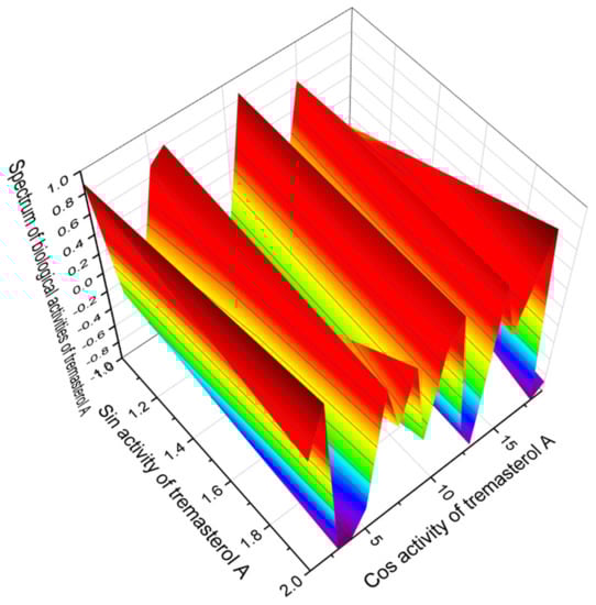 The 3D graph showing the predicted pharmacological activities of tremasterol A (21). Data from the PASS program show that phosphated steroid glycoside named tremasterol A exhibits 20 different biological activities, with dominant properties as a wound healing agent. Interestingly, tremasterol A is isolated from the starfish Trenzaster novaecaledoniae. This is a rare occasion when glycosides from starfish demonstrate such beneficial biological activities.