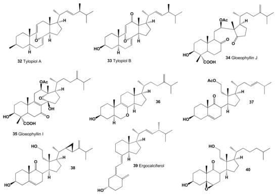Two secosterols, 3β-hydroxy-8α,9α-oxido-8,9-secoergosta-7,9(11),22-triene (32) and 3β-hydroxy-8α,9α-oxido-8,9-secoergosta-7,22-dien-12-one (33), named tylopiol A and B, respectively, were isolated from the fresh fruit bodies of fungus Tylopilus plumbeoviolaceus []. The other two steroids, named gloeophyllin J (34) and I (35), have been isolated from the solid cultures of North American wood-rotting fungi Gloeophyllum abietinum. Both compounds showed cytotoxic activity against human cancer cell lines K562 and HCT116 []. The chemical structures of steroids are shown in Figure 9 and the biological activity is shown in Table 3.