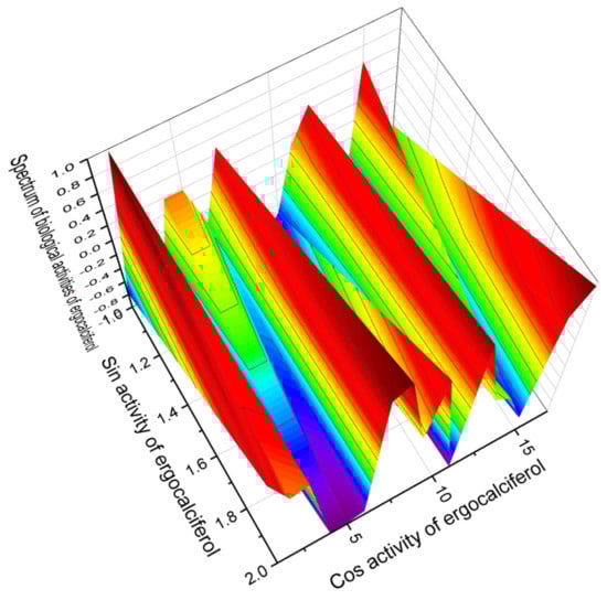 The 3D graph showing the predicted pharmacological activities of ergocalciferol (39). A secosterol hormone called ergocalciferol was first isolated as a radiation product of 7-dehydrocholesterol and described in 1936 by Windaus and co-workers []. Ergocalciferol is an important drug and is recommended by the World Health Organization. In addition, it has anticancer, anti-inflammatory, and antieczema properties, and can also be recommended as an antihypercholesterolemic agent and an agent against Parkinson’s disease. Certain foods, such as breakfast cereals and margarine, contain ergocalciferol in some countries, and it is found in the lichen Cladina arbuscula and alfalfa (Medicago sativa) [,,,,].