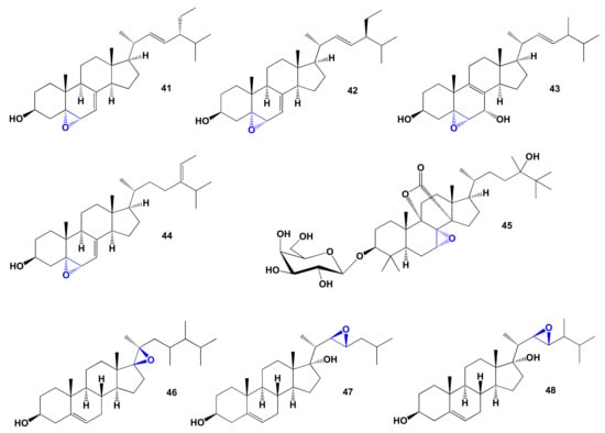 α,α-epoxy- and/or β,β-steroids are found in lipid extracts of marine invertebrates, including sponges, soft corals, starfish, and nudibranchs (Mollusca) [,,,,,]. Two cytotoxic epoxysteroids, 5α,6α-epoxystigmasta-7,22-en-3β-ol (41) and 5α,6α-epoxystigmasta-7-en-3β-ol (42) were isolated from the ethanolic extract of the marine sponge Ircinia aruensis []. The chemical structures of steroids are shown in Figure 12 and the biological activity is shown in Table 4. Topsentisterol B4 (43), epoxy steroid with the β- and α-hydroxyl groups at position 3 and 7, respectively, were present in the extract of the far eastern sponge of Topsentia sp. []. (24E)-5α,6α-epoxystigmasta-7,24(28)-dien-3β-ol (44) was isolated from the South China Sea sponge Phyllospongia foliascens without studying the biological activity []. Triterpene glycoside, eryloside U (45) with be the 7,8-epoxide group was isolated from the sponge Erylus goffrilleri collected near Arresife-Seko Reef (Cuba) [].