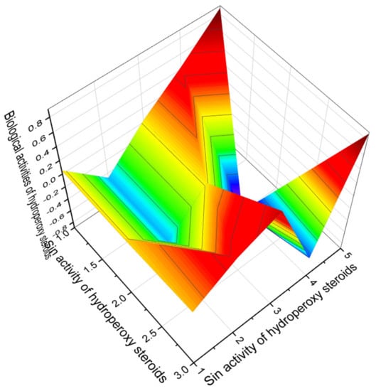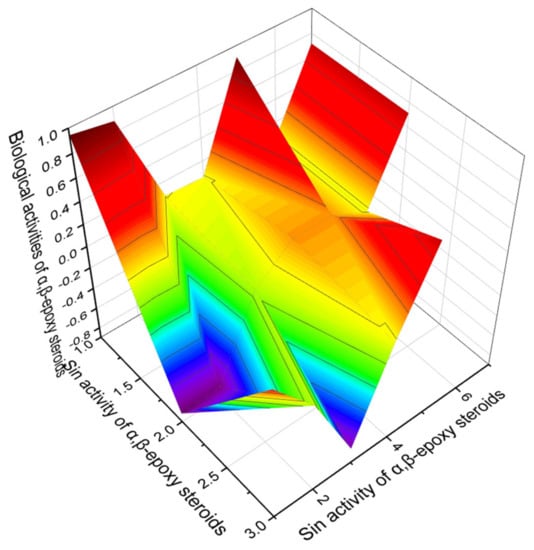 Comparing the data from the PASS obtained for the α, β-epoxy steroids presented in Table 4, it can be concluded that there are no outstanding steroids with lipid metabolism regulator properties; then, we present in Figure 13 a comparative 3D graph for this subgroup of steroids.