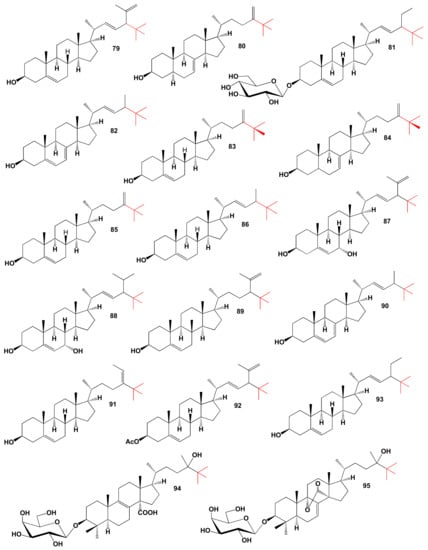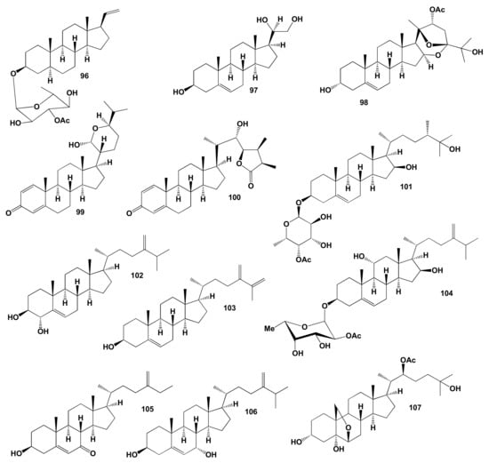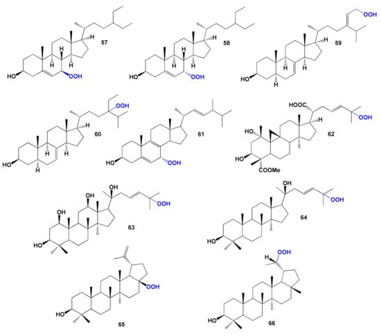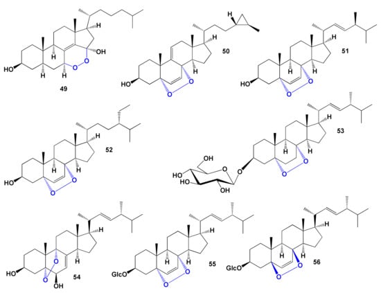 Cytotoxic steroid, (3,5,8,24R,25R)-epidioxy-24,26-cyclocholesta-6,9(11)-dien-3-ol (50) was identified from marine sponge Tethya sp. []. (3,5,8,24R)-Epidioxy-24-methylcholest-6-en-3-ol (51) was detected in MeOH extract of the marine sponge Luffariella cf. variabilis [], and 22,23-dihydro-5,8-epidioxystigmast-6-en-3-ol (52) was found in the marine sponges Luffariella cf. variabilis and Tethya sp. and sea squirt Dendrodoa grossularia [,,,].