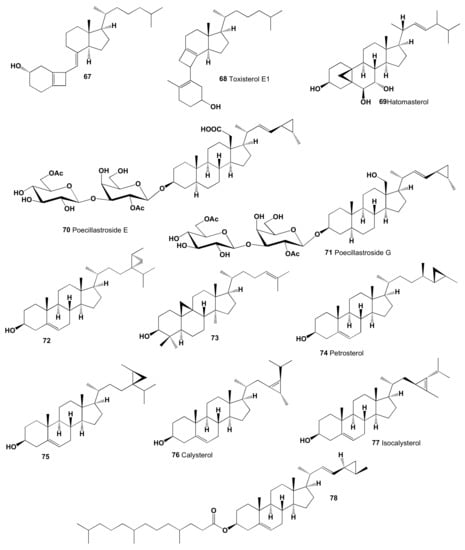 - Ishibashi, M.; Yamagishi, E.; Kobayashi, J. Topsentinols A-J, new sterols with highly branched side chains from marine sponge Topsentia sp. Chem. Pharm Bull. 1997, 45, 1435–1438. [Google Scholar] [CrossRef]