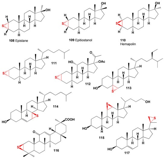 - Dembitsky, V.M.; Gloriozova, T.A.; Poroikov, V.V. Pharmacological activities of epithio steroids. J. Pharm. Res. Int. 2017, 18, 1–19. [Google Scholar] [CrossRef]