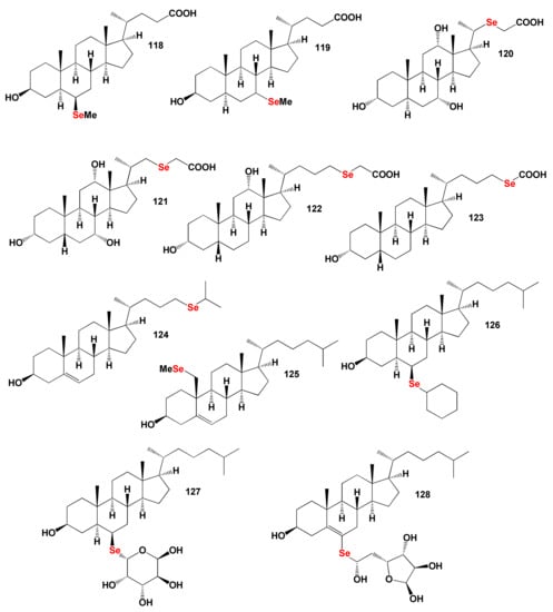 - Dembitsky, V.M.; Gloriozova, T.A.; Poroikov, V.V. Biological activities of organometalloid (As, At, B, Ge, Si, Se, Te) steroids. J. App. Pharm. Sci. 2017, 7, 184–202. [Google Scholar]
