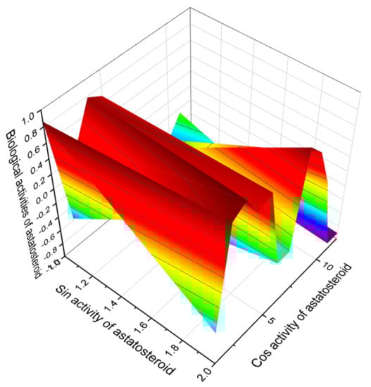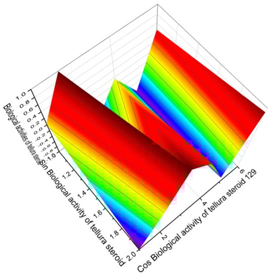 The 3D graph (X (a) and Y (b) views) shows the predicted and calculated antiovulation activity of aromatic steroids (compound numbers: 7, 9, 1, 8, and 10) showing the highest degree of confidence, more than 92.5%. These steroids are derived from animals, including humans, as well as the extract of bark from the main wooden rod of ketapang Terminalia catappa, and can be used in clinical medicine as potential agents with strong ovulation inhibitors. The units of measurement of the x–y digits (Cos–Sin or Sin–Sin) are the relative dimensions that the Origin Pro 2021 graphics program chooses independently, depending on the data obtained by the PASS program. On the 3D graphs, the Origin Pro software in red indicates the maximum biological activity of an individual steroid, and blue indicates the minimum activity.