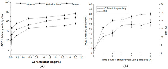 ACE-inhibitory activity of T. flavidus hydrolysates (TFHs). (A) The ACE-inhibitory activity of TFHs was obtained with alcalase, neutral protease, and pepsin. (B) Time course of ACE-inhibitory activity and degree of hydrolysis (DH) of TFHs that were obtained with alcalase.