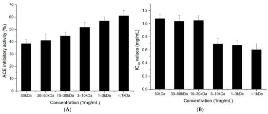 Hydrolysis using alcalase generally yields a mixture of peptides with various sizes and sequences. Ultrafiltration is commonly used to separate the bioactive peptides with different molecular weights (MWs) from the hydrolysate [26]. We fractionated the TFHs using ultrafiltration through 1, 3, 10, 30, and 50 kDa molecular weight cut-off filtration membranes to obtain fractions with MWs < 1, 1–3, 3–10, 10–50, and >50 kDa. The ACE-inhibitory activity gradually increased as the MW of the components decreased (Figure 2A). The ultrafiltrate fraction with MW < 1 kDa had higher inhibitory activity, and thus lower IC50 (0.58 mg/mL), than the fractions with MW > 1 kDa (Figure 2A,B). The results indicated that the low-MW peptides were generally more active than high-MW peptides, which was basically in accordance with the previous research [27,28]. It is believed that short-chain peptides can acquire a spatial conformation that allows them to be positioned within the three-dimensional conformation of the ACE, restricting the access of high-MW peptides [29]. Therefore, the <1 kDa fraction of TFHs was chosen for further separation and purification.