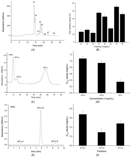 Purification of T. flavidus peptides: (A) chromatogram of the fractions that were isolated from the fraction of <1 kDa using semi-preparative liquid chromatography, (B) ACE-inhibitory activity of the fractions that were obtained via semi-preparative liquid chromatography, (C) chromatogram of the fractions that were isolated from A7 using Sephadex G-15 gel chromatography, (D) ACE-inhibitory activity of the fractions that were obtained via Sephadex G-15 gel chromatography, (E) chromatogram of the fractions that were isolated from A7-c using RP-HPLC, and (F) ACE-inhibitory activity of the fractions that were obtained via RP-HPLC.