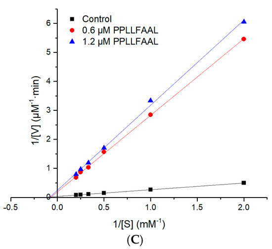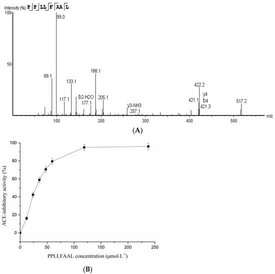 To identify the potential ACE-inhibitory peptide, the most active sub-fraction, namely, A7-c-2, was analyzed using LC–MS/MS and identified with the PEAKS Studio software. As shown in Figure 4A, the amino acid sequence of the peptide was PPLLFAAL (Pro-Pro-Leu-Leu-Phe-Ala-Ala-Leu, MW = 841.05 Da). The peptide had not been reported previously. It was chemically synthesized so that we could identify its ACE-inhibitory activity. The results showed that PPLLFAAL exhibited high ACE-inhibitory activity, with an IC50 value of 28 μmol·L−1 (Figure 4B). The inhibition of PPLLFAAL was analyzed according to the Lineweaver–Burk plot method. The peptide was co-incubated with various substrate (hippuryl-l-histidyl-l-leucine (HHL)) concentrations and an ACE solution, and the corresponding double-reciprocal velocity–substrate plot is shown in Figure 4C. When the concentration of PPLLFAAL increased, 1/Vmax increased, whereas Vmax decreased and Km did not significantly change, which indicates that its inhibition mode may be a non-competitive one.