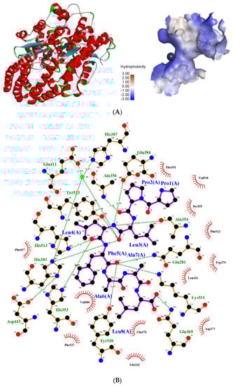 The ACE molecule contains three main active site pockets in the ACE catalytic site, named S1, S2, and S1′ [34]. Hydrogen bond interactions play an irreplaceable role in stabilizing the structure of the enzyme–substrate complex; thus, they are essential for the ACE-catalyzed reaction [42]. Our molecular docking studies indicated that PPLLFAAL was bound to a narrow cavity inside ACE with a relatively extended conformation. The cavity had certain hydrophobicity and hydrophilicity, thanks to which, it could interact well with PPLLFAAL (Figure 5A). According to our simulations, the peptide was bound to the active site pocket of ACE through a network of hydrogen bonds and hydrophobic and van der Waals interactions (Figure 5B). In our model, PPLLFAAL formed 10 hydrogen bonds with residues Glu384, Ala354, Gln281, Lys511, Tyr520, His353, His383, His513, Gln369, and Ala356, and 12 hydrophobic interactions with residues Glu162, Phe457, Val380, Phe527, Glu376, Asp377, Leu161, Trp279, Phe512, Ser355, Val518, and Phe391. Namely, two hydrogen bonds were formed in the S1 active pocket (Ala354 and Glu384), five hydrogen bonds were formed with the S2 pocket (Gln281, His353, Lys511, His513, and Tyr520), and there were hydrophobic interactions with the S1′ pocket. The formation of these interactions greatly stabilized the enzyme–peptide complex. Furthermore, because ACE is a metalloenzyme with a zinc ion in the active site, which is coordinated with His348, Glu372, and His344, the presence of Zn(II) plays an important role in ACE inhibition [43]. The Leu3 of PPLLFAAL was coordinated to the Zn(II) ion, which may be the cause of the deactivation of ACE (Figure 5C). The stability of the ACE–peptide complex was studied using molecular dynamics (MD) simulations. Root-mean-square deviation (RMSD) is an important parameter that is used to indicate the stability of an enzyme–peptide system [44]. It reflects the extent to which protein molecules deviate from their initial structure with the peptide during the dynamic simulation. As shown in Figure 5D, the RMSD of the ACE–PPLLFAAL complex exhibited a large transition, from 0.11 nm to 0.15 nm in 3 ns, then it floated around 0.16 nm. The RMSD values below 0.2 nm during the MD simulations revealed that equilibration of the complex system had been achieved [45].