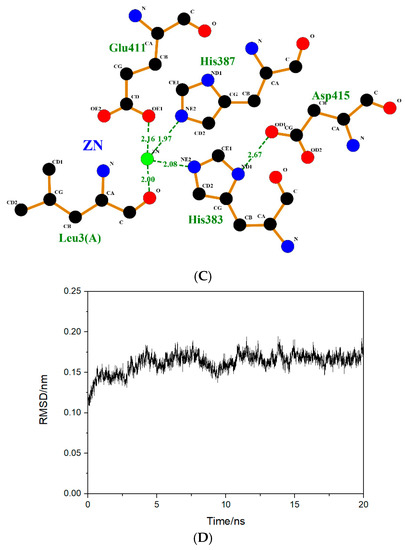 The molecular docking simulations of PPLLFAAL with ACE (PDB: 1O8A): (A) general overview and the best-ranked docking pose of peptide PPLLFAAL at the active site, (B) the interactions between PPLLFAAL and the residues of ACE, (C) the interactions between PPLLFAAL and the Zn2+ of ACE, and (D) the change in the root-mean-square deviation (RMSD) of the ACE–PPLLFAAL complex over time.