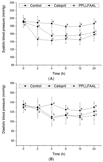Changes in spontaneously hypertensive rats’ blood pressure after the intravenous administration of PPLLFAAL: (A) SBP changes and (B) DBP changes. Different letters indicate statistically significant differences, as demonstrated using multiple one-way analysis of variance tests (p < 0.05).