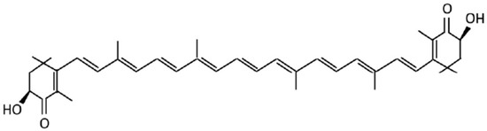 Carotenoid astaxanthin (AST) is a red-orange pigment primarily found in organisms, such as shrimp, algae, fish, and crustaceans, containing two oxygenated ends on each tail of the structure (Figure 1) [5,6]. This natural dietary carotenoid has a variety of functions, including antioxidant, anti-inflammatory, and antitumor properties [7,8,9,10]. Moreover, a previous study demonstrated that AST might be safe and well tolerated in rats [11].