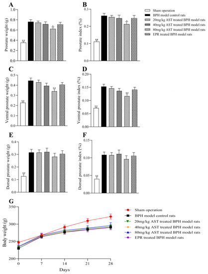 The body weights of rats treated with AST or epristeride (EPR) for four weeks are shown in Figure 2G. The prostate index was defined as the ratio of prostate weight to the rat’s body weight. The same effects shown in the prostate weights and ventral prostate weights were also found in the prostate index and ventral prostate index values in the AST-treated and EPR-treated rats (Figure 2B,D). The dorsal prostate index values in the treated groups and the BPH model control group did not differ significantly, as shown in Figure 2F.