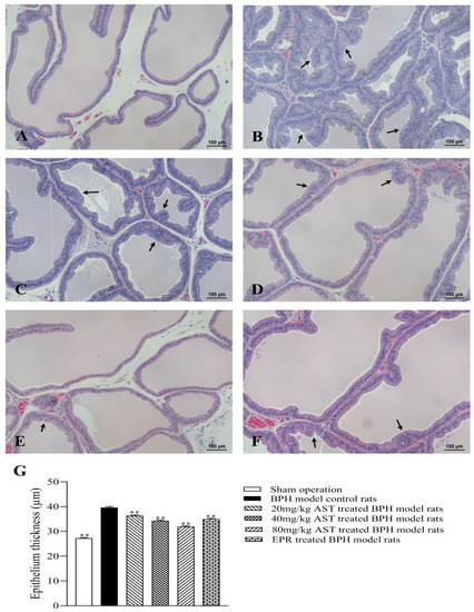 Effect of AST on histomorphology and epithelial thicknesses of ventral prostates in BPH rats. (A) No abnormal histological changes were observed in the sham operation; tall columnar epithelium, simple multifocal epithelial thickening with cellular crowding, and folding of the lining epithelium extending into lumina (arrows) were observed in: (B) the BPH model control rats; (C) 20 mg/kg, (D) 40 mg/kg, and (E) 80 mg/kg AST-treated BPH rats; (F) EPR-treated BPH rats; Hematoxylin and eosin (H&E) 100×; (G) epithelial thicknesses of prostates in the sham operation, BPH model control group, and AST or EPR treated groups. Data represent the mean ± SEM. (n = 12). ** Significantly different from BPH model control group, p < 0.01.
