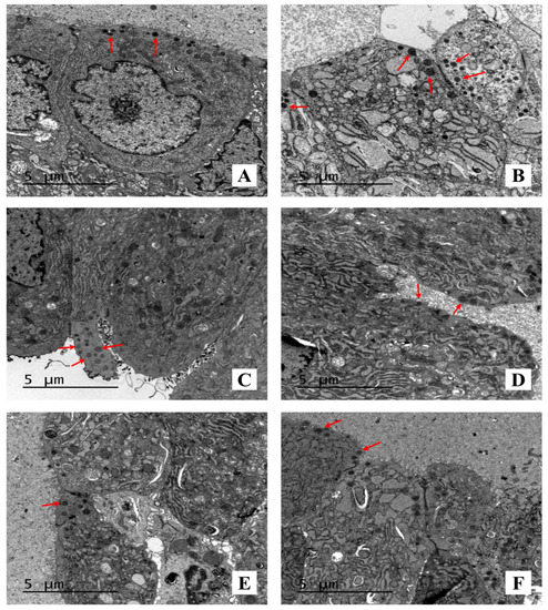 Images of ventral prostates under TEM, 4200×. Secretory granules (arrows) were observed in: (A) Sham operation; (B) BPH model control rats; (C) 20 mg/kg, (D) 40 mg/kg, and (E) 80 mg/kg AST-treated BPH rats; (F) EPR-treated BPH rats.