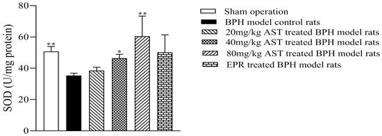 SOD is an important antioxidant enzyme in organisms. The effect of AST on the SOD activity of ventral prostates in the BPH model rats is shown in Figure 5. As compared with the BPH model control rats, the SOD activity of prostates in the AST-treated rats increased in a dose-dependent manner, while the SOD activity of prostates in the 40 mg/kg (p < 0.05) and 80 mg/kg (p < 0.01) AST-treated rats increased significantly.