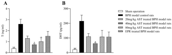 AST decreased levels of T (A) and DHT (B) in ventral prostates. Data represent the mean ± SEM. (n = 5). * Significantly different from BPH model control group, p < 0.05, and ** significantly different from BPH model control group, p < 0.01.