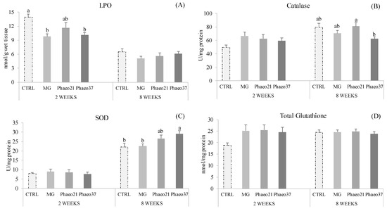 Liver oxidative stress biomarkers of gilthead seabream juveniles after 2 and 8 weeks feeding. Lipid peroxidation (LPO) (A); Catalase activity (CAT) (B); Superoxide dismutase activity (SOD) (C) and Total Glutathione (D). Data are the mean ± SEM (n = 12). Different lowercase letters indicate significant differences between dietary treatments (p < 0.05).
