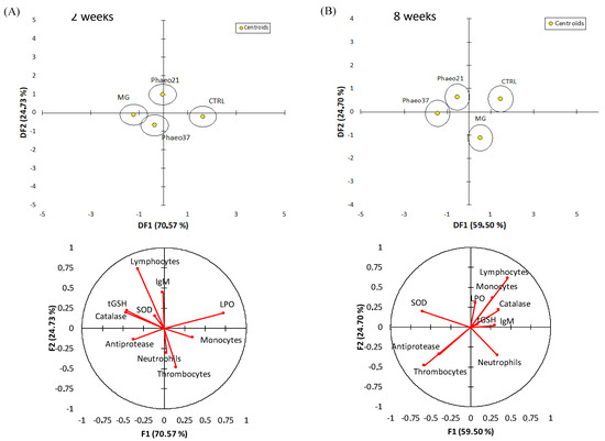 An overall multivariate analysis combining raw data from haematological, humoral and hepatic oxidative stress biomarkers (using PCA-DA) was performed to discriminate the physiological effects caused by the experimental diets both at 2 and 8 weeks of feeding (Figure 2). The first two discriminant functions accounted for 95% of dataset variability at 2 weeks. Group discrimination was significant (Wilk’s lambda = 0.3, p = 0.01) highlighting the differences between CTRL and BG groups (p < 0.03). This discrimination was loaded by lower lipid peroxidation, higher CAT and tGSH and to a lesser extent higher antiproteases activity in BG groups. At 8 weeks, groups were discriminated (Wilk’s lambda = 0.2; p < 0.001) and the first two discriminant factors accounted for 84% of dataset variability. CTRL and MG dietary treatments were significantly discriminated from the Phaeo groups (p < 0.04) and this separation was loaded by a higher SOD activity and thrombocyte percentage in the last groups.