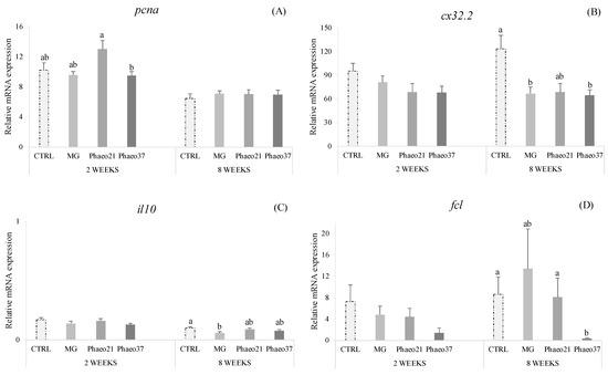 Different pathways represented in this gene array showed significant dietary effects in the proximal intestine. Proliferating cell nuclear antigen gene (pcna) was down-regulated in Phaeo37-fed fish at 2 weeks (Figure 3A). In contrast, different genes belonging to different molecular and cellular pathways were down-regulated in seabream-fed Phaeo37 after 8 weeks of feeding, in particular, fucolectin (fcl) (Figure 3D), as well as gap junction cx32.2 protein (cx32.2) (Figure 3B) genes. Moreover, the latter gene was down-regulated in fish fed MG as well as interleukin 10 (il10) (Figure 3C). Complete relative gene expression profile of the anterior intestine is provided as Supplementary Material (Tables S1 and S2). According to the Supplementary Tables, it was found that the mRNA expression levels of the other analysed genes showed no statistically significant differences among experimental groups.
