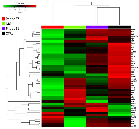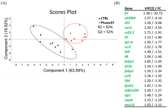 Further differences between fish fed the experimental diets in comparison to CTRL were highlighted by a clustering heatmap of gene expression after 8 weeks of feeding (Figure 4). This approach pointed to Phaeo37 as the experimental diet more apart from CTRL in the gene expression pattern. In order to get a clearer picture of the dietary effect on intestinal gene expression, an overall multivariate analysis combining raw data from the different genes (using PLS-DA) in CTRL and Phaeo 37 groups was performed. For the 2 weeks feeding period, the model was not able to show a clear separation between experimental groups (data not shown). However, at 8 weeks, the same approach showed that expression patterns can be summarized through two main components that explain 88.11% of total variance (Figure 5A). On the one hand, component 1 (63.59% of total variance, X-axis) appeared to be mostly related to diet effect, as it was able to clearly separate Phaeo37- and CTRL-fed fish. On the other hand, component 2 (19.52% of total variance, Y-axis) appeared to account for inner group variability. A total of 20 genes showed a VIP value > 1, highlighting their contribution to diet differences (Figure 5B).
