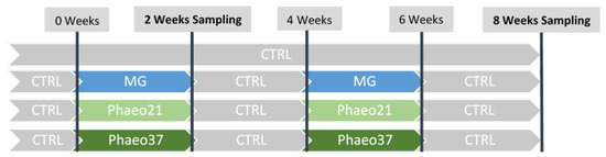 Fish were reared in a seawater recirculation system with aeration (mean dissolved oxygen above 6 mg L−1) and water flow at 3 L min−1 (mean temperature 24.1 ± 0.6 °C; mean salinity 18.7 ± 0.1‰). Water quality parameters were monitored daily (mean dissolved oxygen 6.4 ± 1.0 mg L−1; mean unionized ammonia levels 0.001 ± 0.002 mg L−1). Diets were randomly assigned to quadruplicate groups of 95 gilthead seabream juveniles (initial body weight: 4.1 ± 0.1 g) that were fed to satiation three times a day for 8 weeks in a pulse-feeding regimen. Accordingly, in fish fed the different experimental diets, the CTRL diet was intercalated every 2 weeks, as shown in Figure 6.