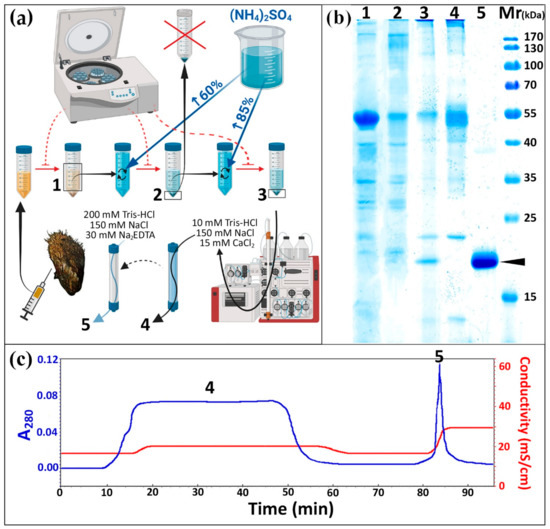 - Wingfield, P. Protein Precipitation Using Ammonium Sulfate. In Current Protocols in Protein Science; John Wiley & Sons, Inc.: Hoboken, NJ, USA, 1998; pp. A.3F.1–A.3F.8. [Google Scholar]