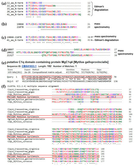 Amino acids sequencing of MkC1qDC: N-terminal peptides from Edman’s degradation (a); alignment of two fragments obtained by mass-spectrometric de novo sequencing (b) identical to Edman’s degradation results (c); alignment of three de novo peptides (d) that had high quality of matches with C1qDC or C1q-like proteins from other Bivalvia (e); alignment of full-length MkC1qDC sequence assembly with nearest homologues (f).