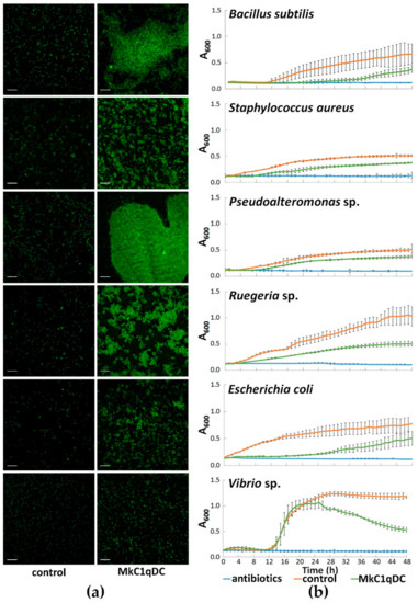MkC1qDC had antibacterial activity against both Gram-positive (Bacillus subtilis, S. aureus) and Gram-negative (Vibrio sp., Ruegeria sp., E. coli, Pseudoalteromonas sp.) bacteria (Figure 4). At the same time, agglutination occurred most effectively in the cases of Pseudoalteromonas sp. and B. subtilis, which in the presence of MkC1qDC formed the largest conglomerates, in contrast to Vibrio sp., which were united into small sparse groups of 4–15 cells. In addition, MkC1qDC showed bacteriostatic properties against most of the above strains as significant growth suppression started after 4–12 h (p < 0.05). The only exception was Vibrio sp. The decrease in the density of the Vibrio sp. cultures in the presence of MkC1qDC occurred only after 26 h of cultivation (p < 0.05) when the control was in a stationary phase (Figure 4).
