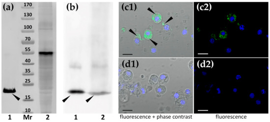 Detection of MkC1qDC (narrow labeled) in the components of M. kurilensis hemolymph: in plasma (a,b) and in hemocytes (c,d). (a) Electrophoresis; (b) Western blotting (1—purified MkC1qDC; 2—plasma; Mr—molecular weight standards); (c1,c2) treatment with MkC1qDC antibodies; (d1,d2) control with pre-immune rabbit serum. Nuclei are colored in blue by DAPI. Scale bars: 10 µm.